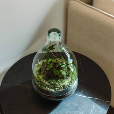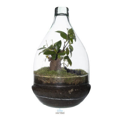 La parte superior es una cúpula sin agujero para que el terrario pueda mantener su ecosistema de forma autónoma, necesitando solo de 1 ó 2 veces al año que la rieguen. Acaba en la parte alta en punta. Si tu terrario se hace grande puedes cambiar la parte superior por la cúpula 30×10. Las dos bases coinciden.